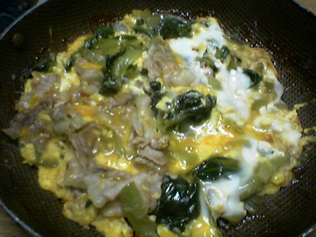 チンゲン菜と豚バラをオイスターソースで炒めて卵でとじました。